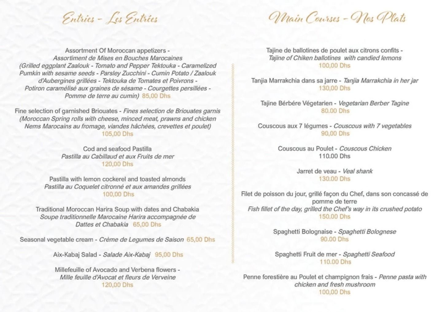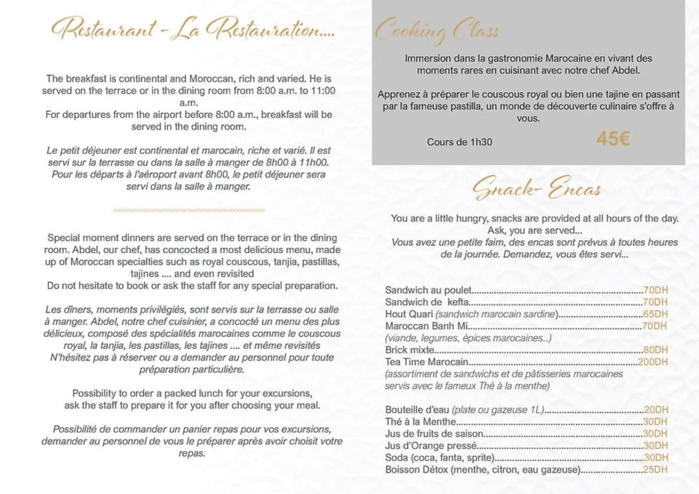 Au Palais Aix Kabaj & Spa, la restauration est une expérience conçue pour ravir vos sens du matin au soir. Notre restaurant et bar sur place vous invitent à un voyage culinaire à travers les saveurs riches et variées du Maroc, préparées avec les ingrédients locaux les plus frais. Commencez votre journée par un délicieux petit-déjeuner, savourez un déjeuner tranquille dans notre élégante salle à manger ou optez pour une collation légère tout au long de l'après-midi. Le soir venu, savourez un authentique dîner marocain, où les recettes traditionnelles sont sublimées par une présentation raffinée. Vous pouvez également commander un délicieux plat à emporter ou vous détendre lors de notre charmant Tea Time. Nous sommes fiers de proposer une variété d'options, notamment la possibilité de déguster vos repas en plein air sur notre magnifique toit-terrasse, offrant une vue panoramique qui sublimera votre expérience culinaire.