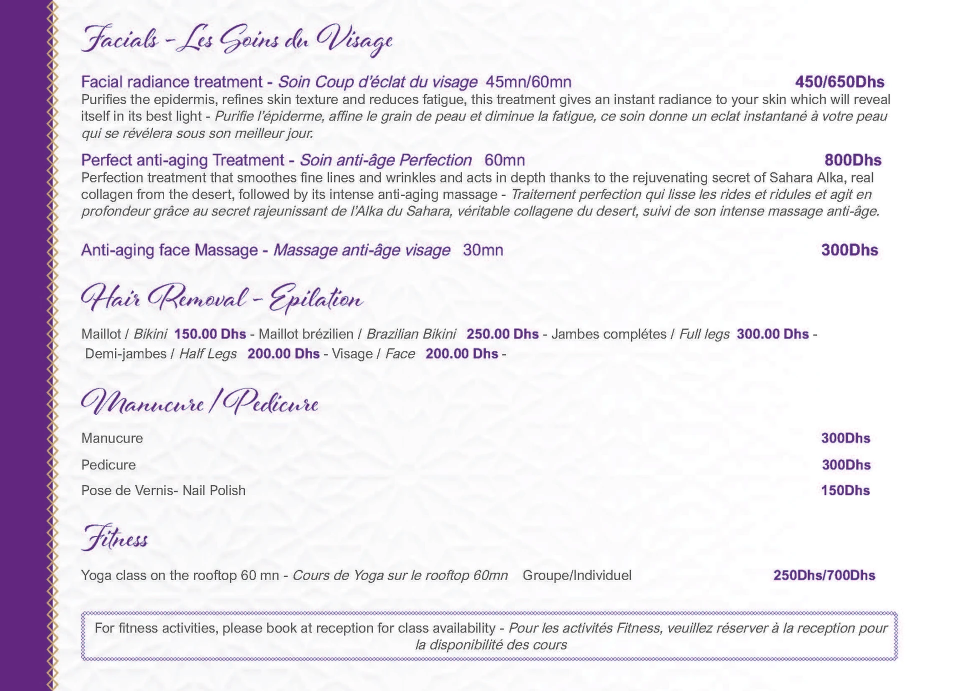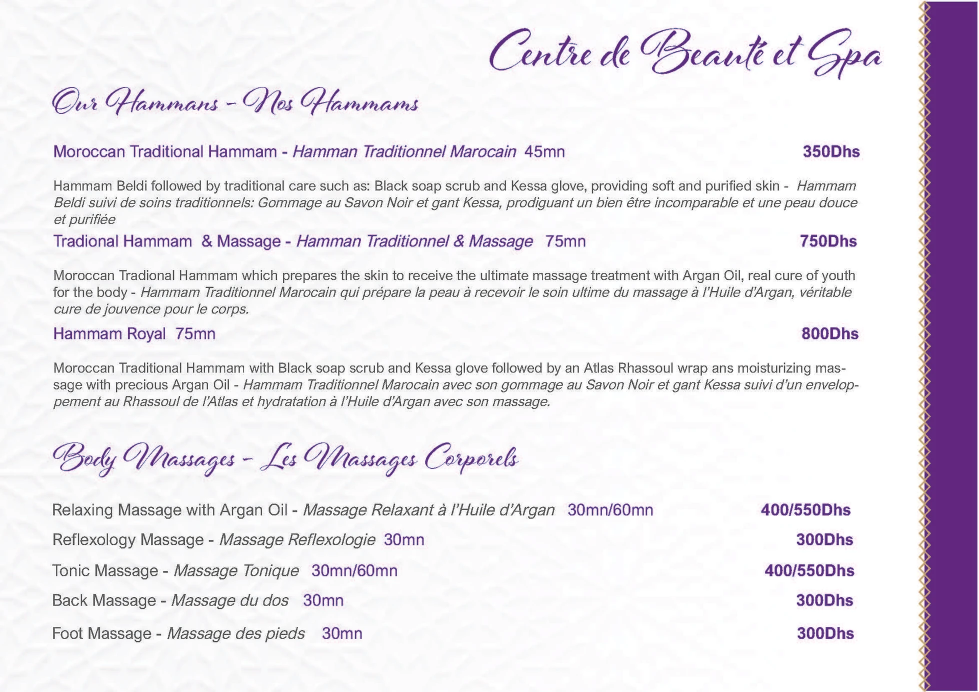 Step into a world of profound relaxation and rejuvenation at the Palais Aix Kabaj Spa. Our serene sanctuary is thoughtfully designed to offer an authentic Moroccan wellness experience, blending ancient traditions with luxurious modern treatments. Here, you can truly unwind and let go of everyday stresses. Indulge in the purifying ritual of a traditional Moroccan Hammam, where warmth and steam prepare your body for invigorating exfoliation and cleansing. Beyond the Hammam, our expert therapists offer a range of blissful services, including therapeutic massages, revitalizing facials, and nourishing body scrubs and wraps. Each treatment is designed to restore balance to your mind, body, and spirit, using high-quality products inspired by the natural bounty of Morocco. Allow yourself to be transported to a state of deep tranquility and emerge feeling refreshed and revitalized.